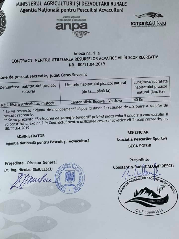 As of the 11th of April 2019, Bistra Ardealului River (middle section, between Bucova and Voislova, in the Caras Severin County, Romania) is under the administration of Bega Poieni Fishing Association, according to the contract no. 80/11.04.2019, between Bega Poieni Fishing Association and Romanian National Agency of Fishing and Aquaculture (ANPA)